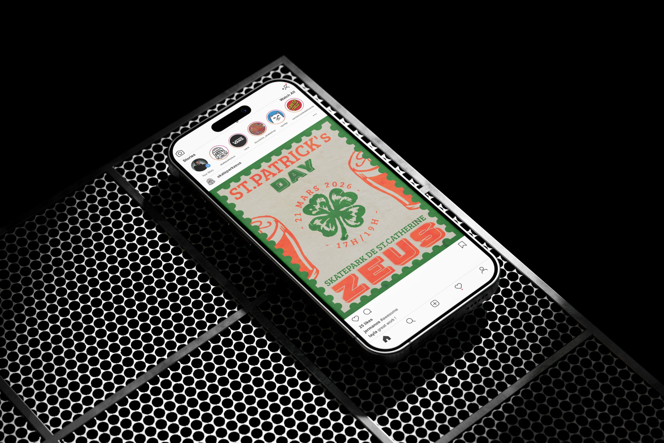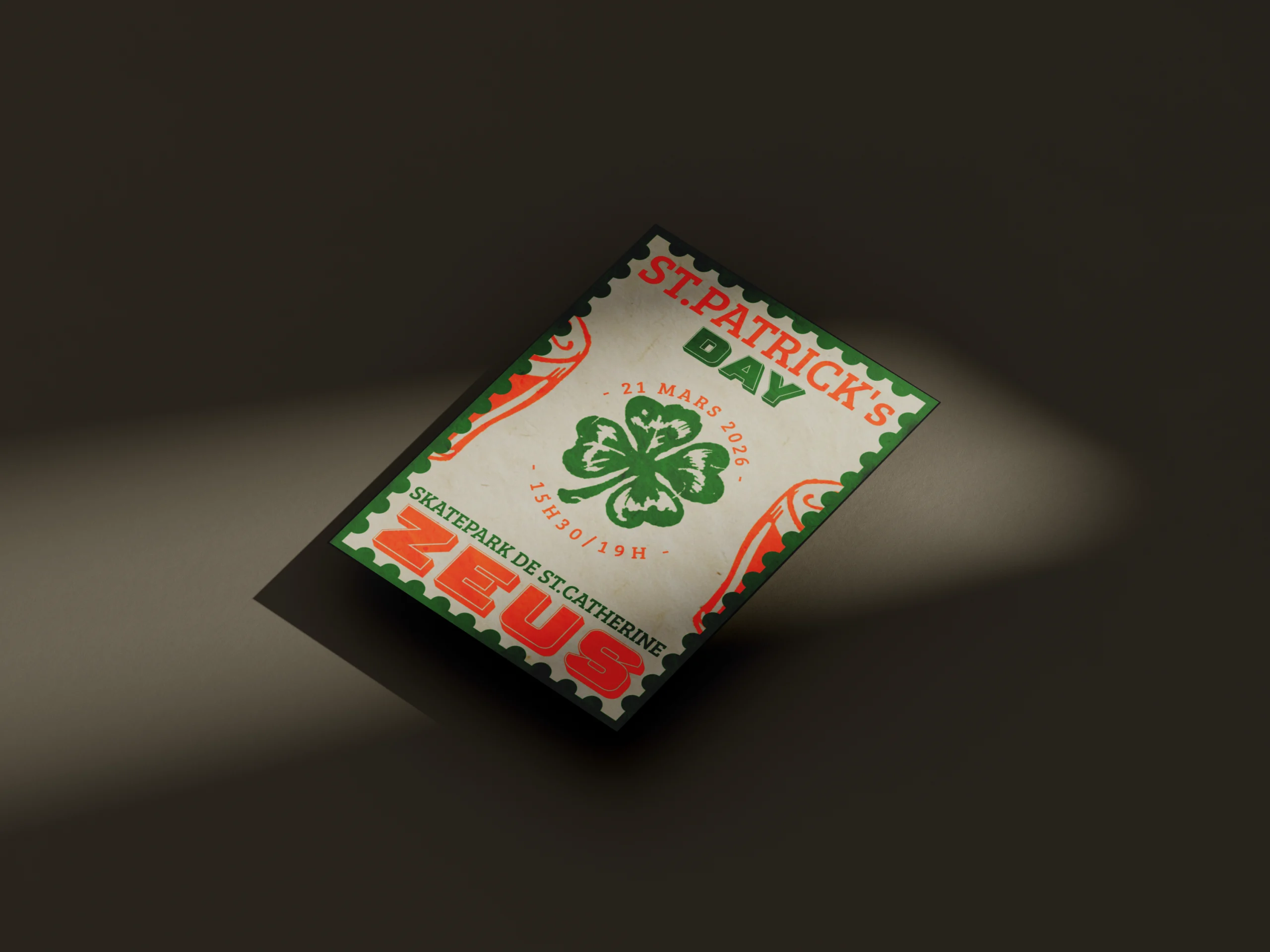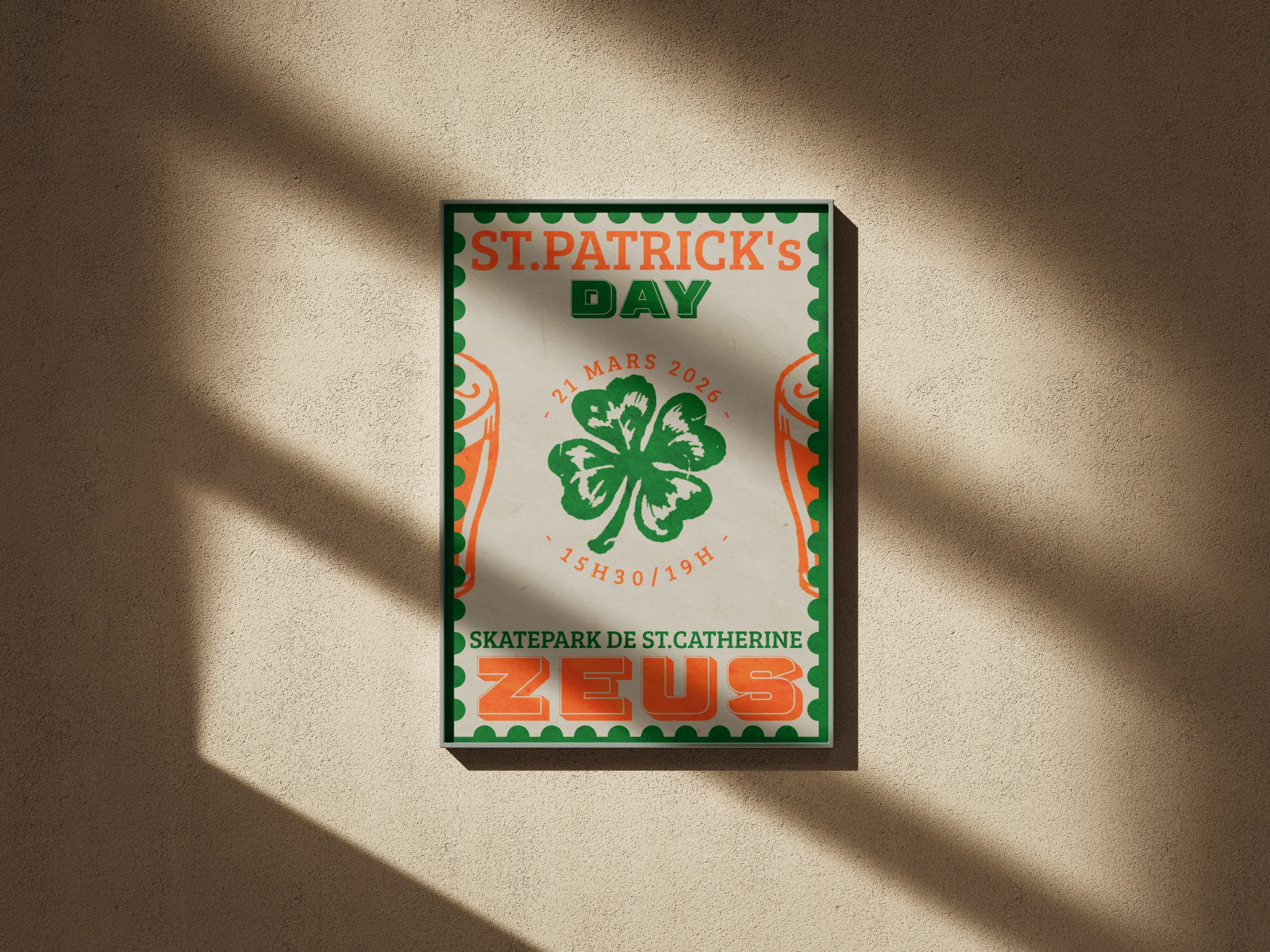 Création d’une affiche promotionnelle, pour la fête de la St-Patrick au skatepark ZEUS, qui s’est déroulé le samedi 21 mars.